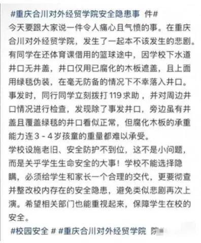 5 月 19 日,重庆对外经贸学院有学生掉进化粪池不幸身亡的消息引发关注。有媒体采访了解到,涉事学生为一名男生,遗体已于当日送往殡仪馆。