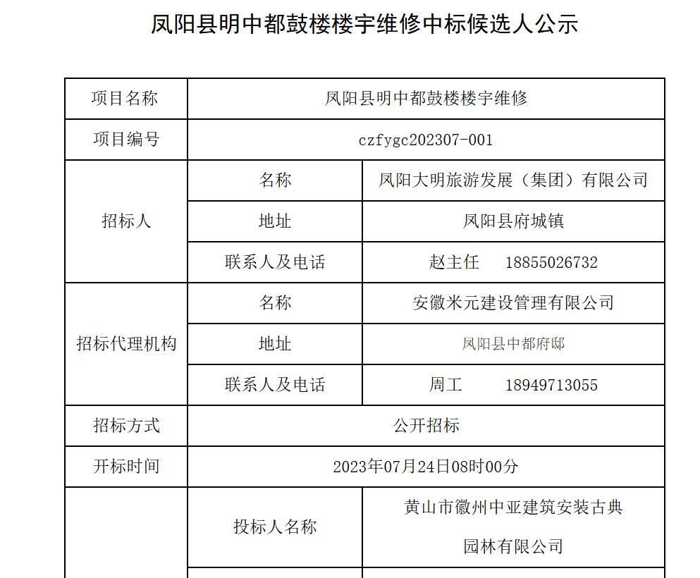 但是,澎湃新闻从滁州市公共资源交易中心查询到的时间点则显示,凤阳县发展和改革委员会批准《凤阳县明中都鼓楼楼宇维修》招标计划的时间为2023年7月3日。这份2023年7月3日发布的文件显示,招标单位为凤阳大明旅游发展(集团)有限公司,监管单位为凤阳县发改委。