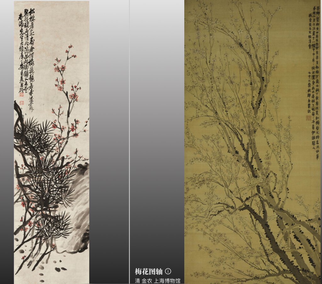 吴作人早年曾留学欧洲,精通油画与素描,将西画的造型能力与中国画的写意精神结合起来,追求的是妙在“似与不似之间”。梅花是吴作人先生晚年常画的题材 ,带有文人画的精神趣味,借鉴了金农、吴昌硕等人的笔意,但又不像金农那般将梅花铺满画面,反而更加简练,红梅点染色彩鲜明但不艳俗,这也与梅花奖的寓意“生机”十分契合。
