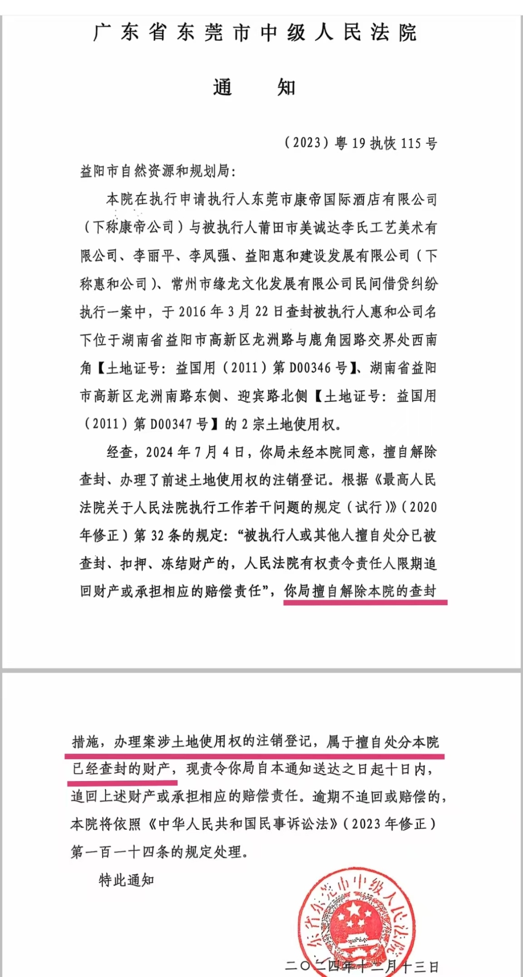 2023年5月湖南高院裁定下达后,经康帝公司申请,2023年6月6日,东莞中院恢复执行,涉案土地再次进入拍卖处置程序。然而,正如前述,益阳自规局又在未通知东莞中院的情况下,于2024年7月解除了法院的查封,并办理了土地注销登记。