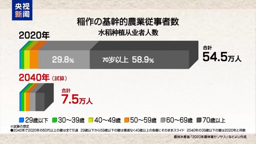 今年 2 月国会众议员讨论会上公布的数据则证实,日本农民平均年龄已超 70 岁,再过 5 到 10 年,农户数量将急剧减少,届时大米价格可能飙升至每 5 公斤 1 万至 2 万日元。而到 2040 年,农户数量预计将进一步骤减。