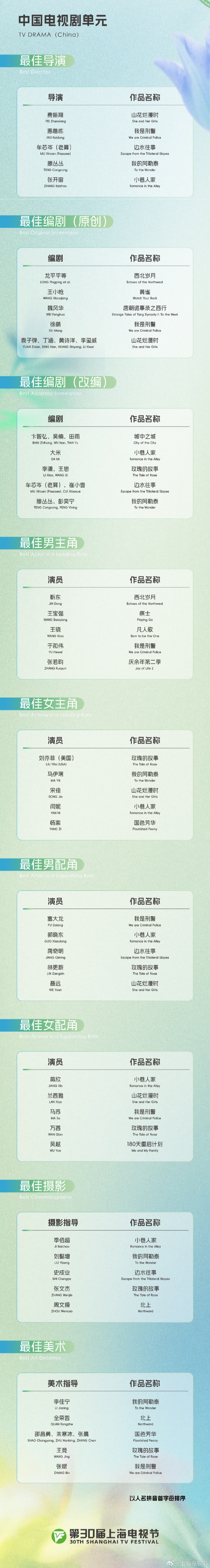 5月26日,第30届白玉兰奖入围名单正式揭晓。《边水往事》《城中之城》《凡人歌》《玫瑰的故事》《庆余年第二季》《山花烂漫时》《我的阿勒泰》《我是刑警》《西北岁月》《小巷人家》等入围最佳中国电视剧奖。