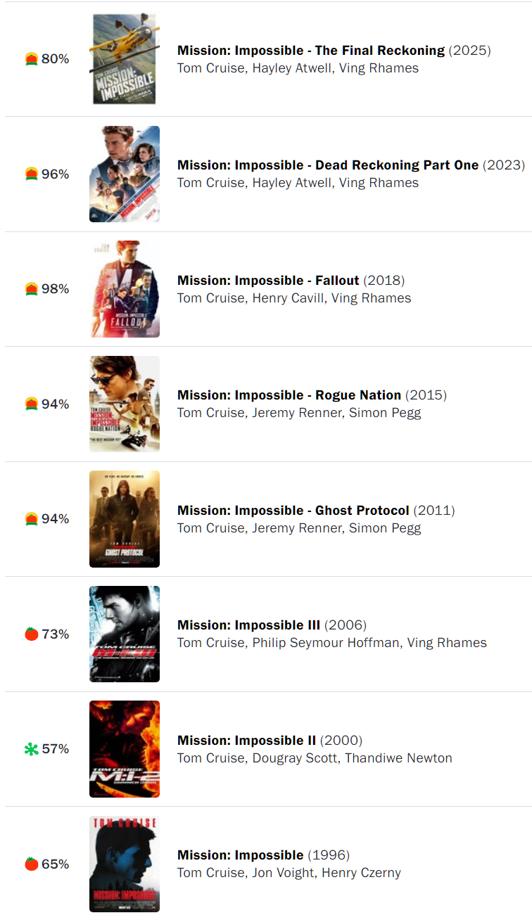 《碟中谍8》在“烂番茄”上的新鲜度仅好于该系列的前三部。