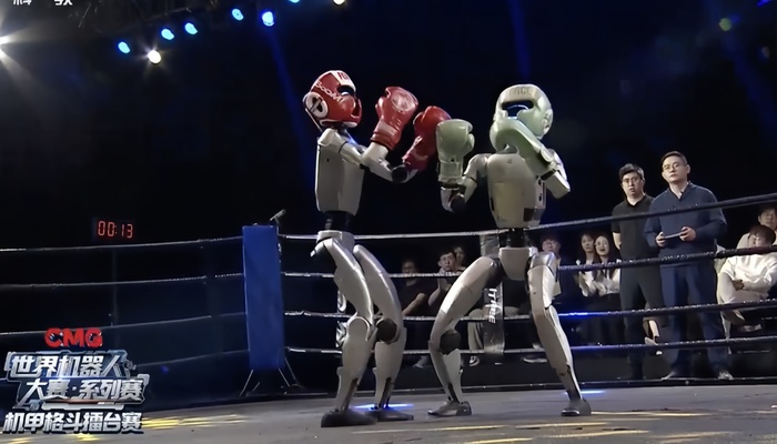 继在北京亦庄开跑马拉松后,机器人又“跨领域”加入到格斗比赛中。
