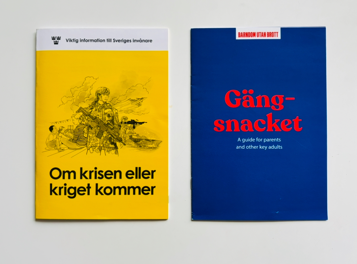 两份瑞典政府于2024年印发的手册:《发生危机或战争时》、《谈谈帮派:给家长和监护人的指南》