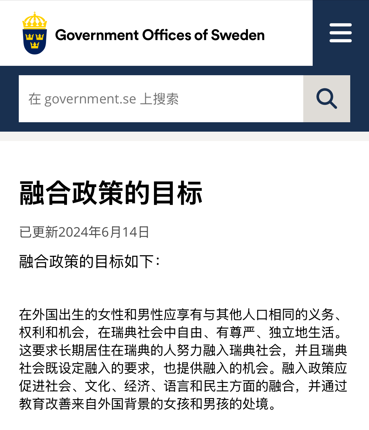 瑞典政府网站对融合政策的介绍。(来源:https://www.government.se/government-policy/integration/the-objectives-of-the-integration-policy/)