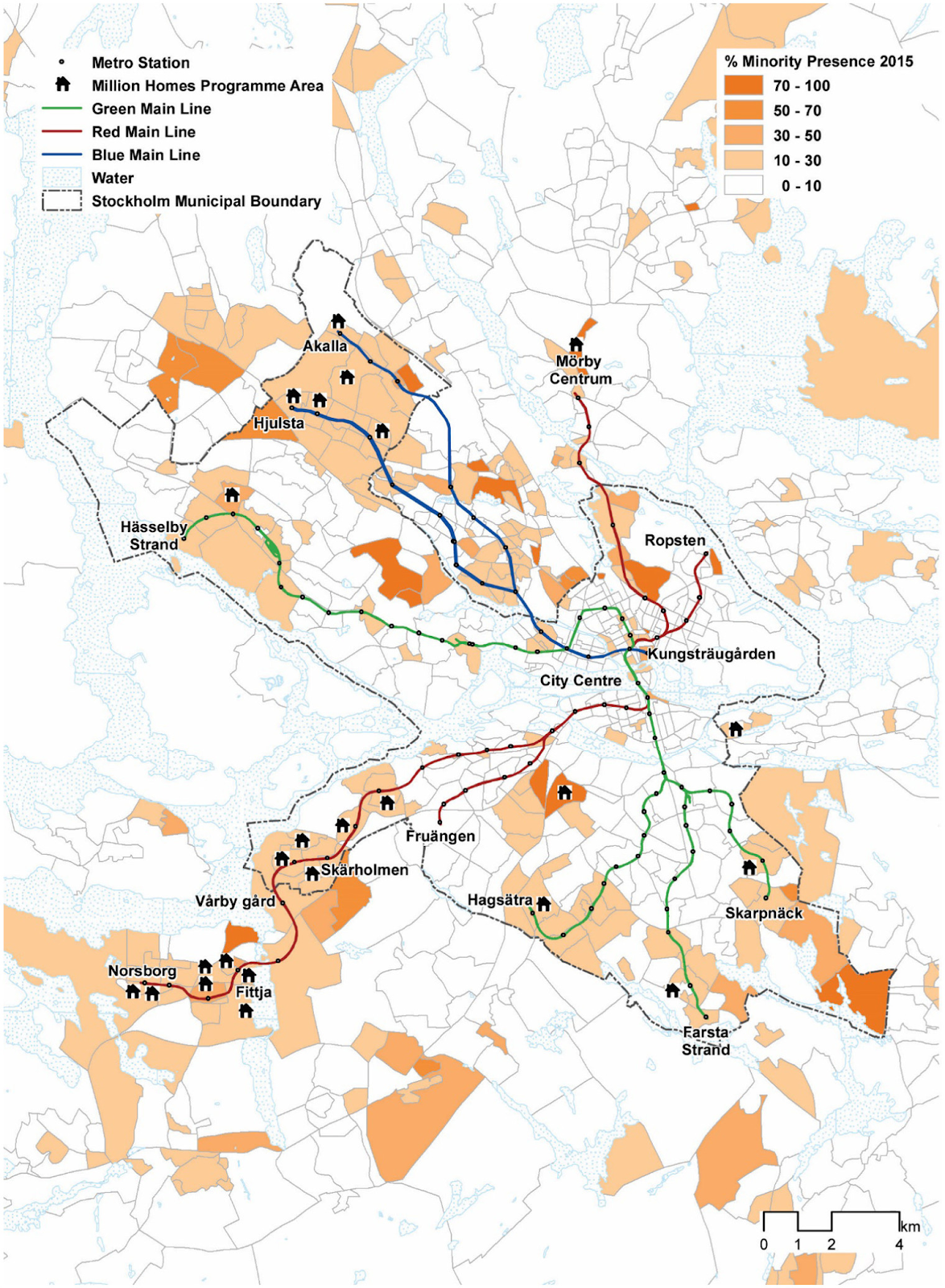 斯德哥尔摩市的“百万计划”住宅区(黑色房子标志)、地铁线路以及2015年的少数族裔居住区(颜色越深代表比例越高)。[8]