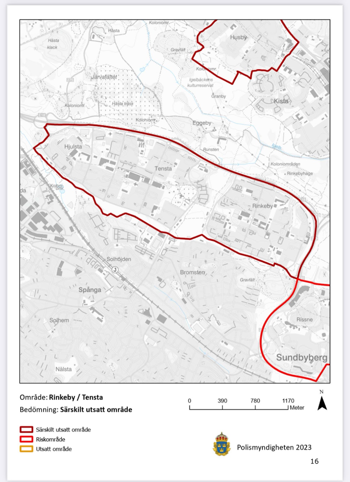 瑞典警方2023年制作的“脆弱地区”地图,下文提及的“Rinkeby/Tensta”区域被划为“特别脆弱区域”。(出处:https://polisen.se/om-polisen/polisens-arbete/utsatta-omraden/)