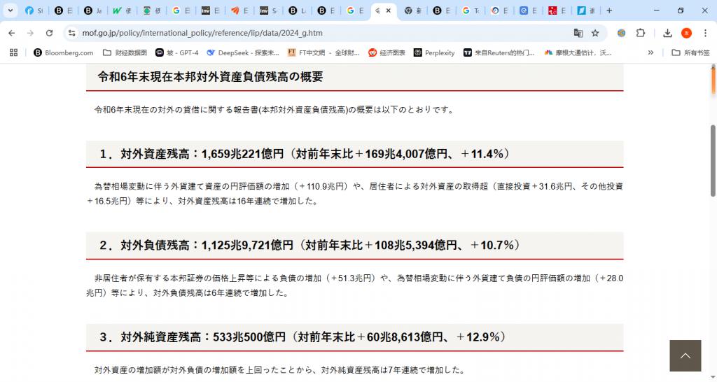 数据显示,截至 2024 年底,日本对外净资产余额——即海外资产总额减去海外负债总额达到了 533.05 万亿日元 ( 约合 3.7 万亿美元 ) ,较上一年度增长约 13%。