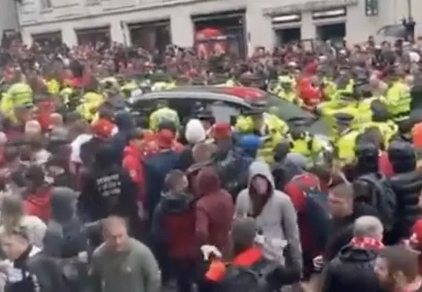 一辆汽车穿过利物浦市中心的人群(图片:Pixel8000)