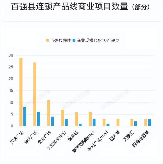目前,万达广场可以称得上是下沉市场中布局最广的商业体。据赢商网统计,截至 2024 年年中,万达广场在全国百强县布局了近 30 个项目,数量绝对第一;主打下沉市场的吾悦广场排在第二,在百强县布局项目数量超过 25 个。