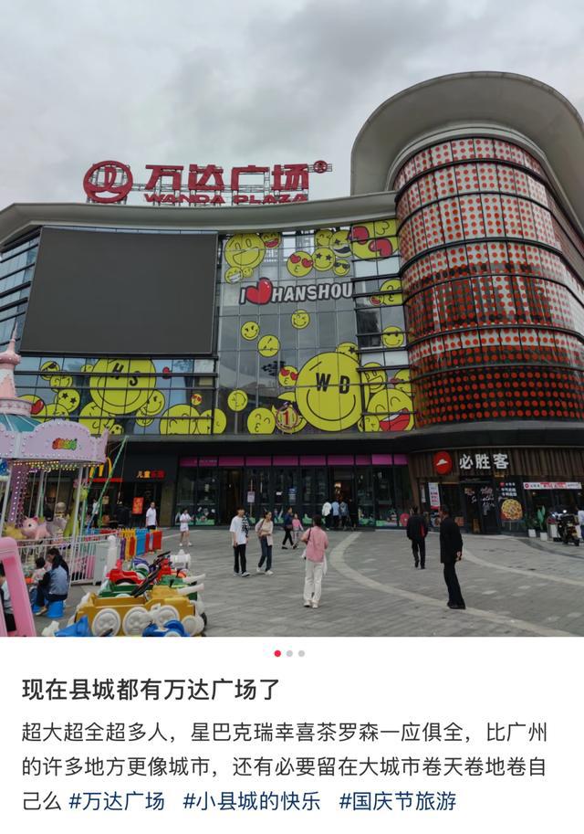 只要一个县城有万达广场入驻,后者对就会对当地原有的传统商业形成 " 降维打击 ",同时引发虹吸效应,变身为当地的著名 " 景点 "。在社交平台上,不少居民以万达开进县城为豪,纷纷前去消费、遛娃。