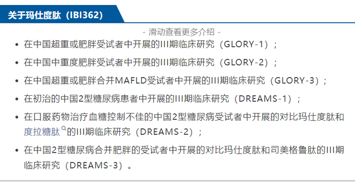 此外,玛仕度肽正在开展的III期临床研究共有6项,均与降糖减重适应症有关,GLORY-1、DREAMS-1和DREAMS-2研究均已达成终点,其他研究还在进行中。