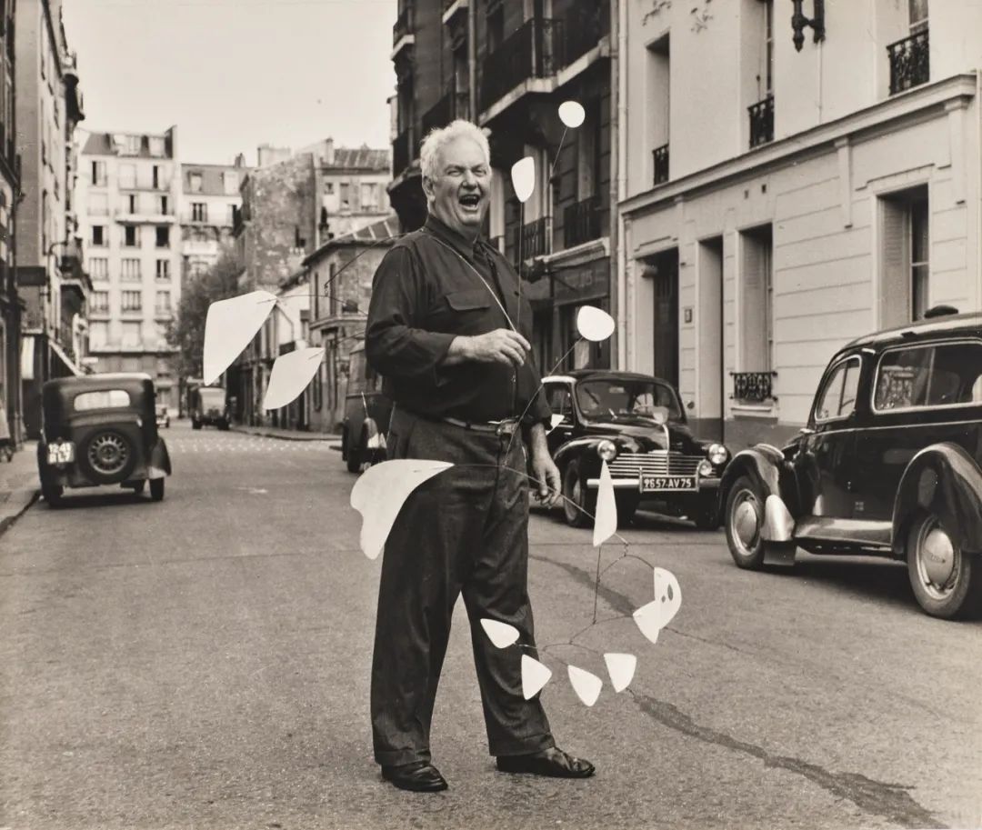 ◥ Agnès Varda, Alexander Calder devant son atelier, Paris 14e, octobre 1954 © Succession Agnès Varda / 2025 Calder. Foundation, New York / ADAGP, Paris