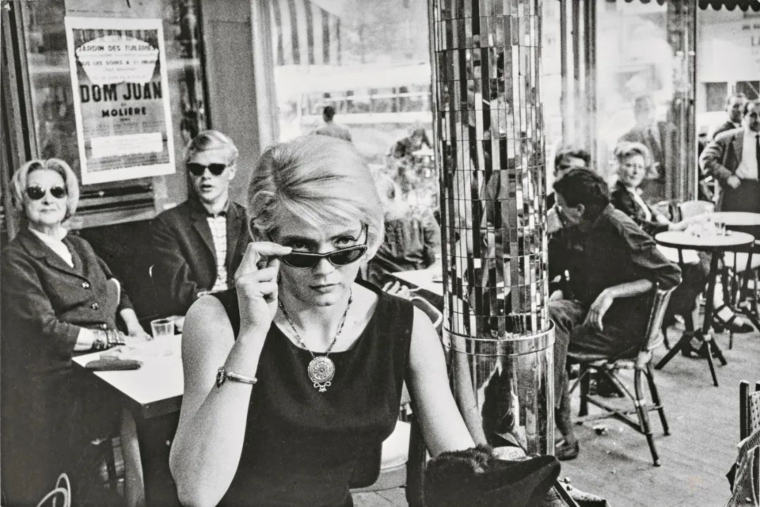 ◥ Photographie de Liliane de Kermadec, Corinne Marchand sur le tournage du film d'Agnès Varda Cléo de 5 à 7. Cléo au café du Dôme, Paris 14e, 1961. Liliane de Kermadec © Ciné-Tamaris