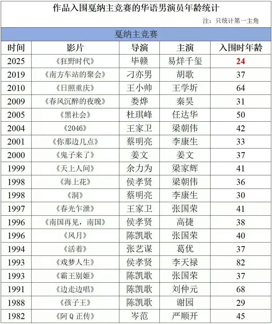点开这些表格,你能见到不少震动内娱粉圈的重磅结论。比如,易烊千玺是入围戛纳主竞赛的最年轻的华语男演员(24岁)——不过,这是一次仅针对一番主角的统计,因此1991年凭借陈凯歌作品《边走边唱》入围的20岁的黄磊被排除在外。