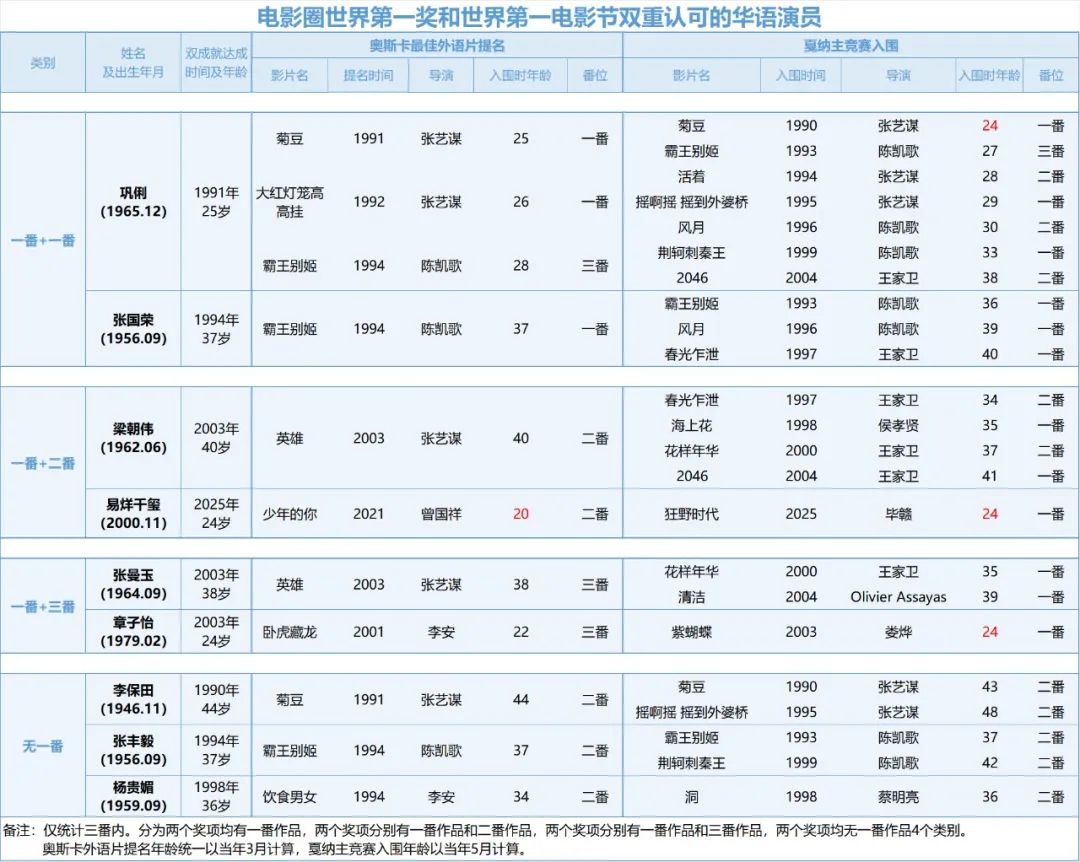 华语演员入围情况统计,图源微博