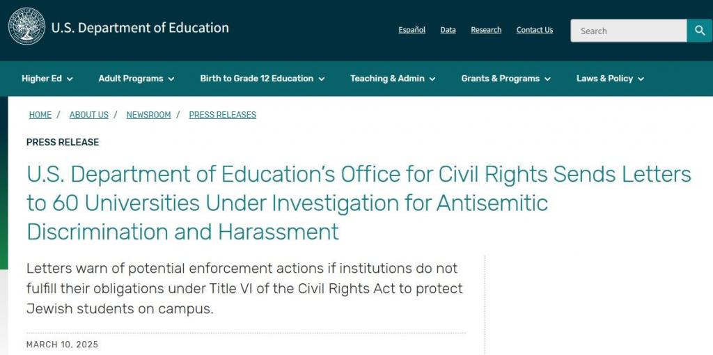 今年 3 月,美国教育部门向 60 所大学及其校区发送信件,警告他们要 " 保护犹太学生 ",否则将 " 面临联邦执法行动 "。这些校园包括了四个加州大学校园——圣地亚哥、圣塔芭芭拉、伯克利和戴维斯,以及南加州大学、波莫纳学院、斯坦福大学、钱普大学、圣莫尼卡学院和萨克拉门托州立大学。
