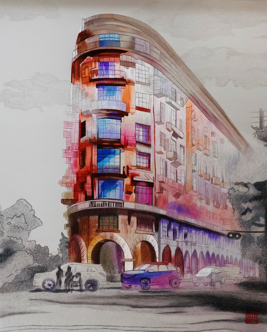 在谈到自己的创作技法时,周雪萍以《上海之武康大楼》这幅作品为例进行了详细介绍。“它是水彩与传统工艺、现代水彩手法的融合。” 周雪萍介绍道,武康大楼是徐汇区的标志性建筑,自己作为徐汇区非物质文化遗产代表性项目“刺绣艺术”代表性传承人,希望通过刺绣为其赋予新的故事。