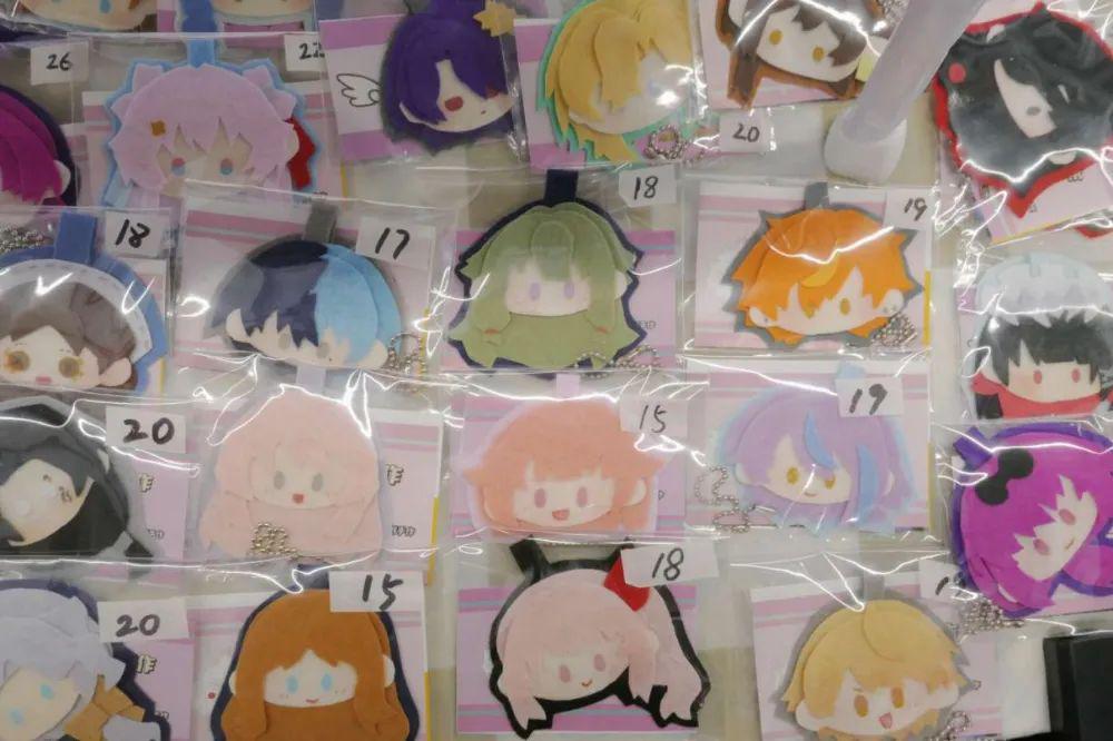 谷子集市开始营业前,她们早早到达地王广场摊位,从楼下仓库搬来一堆让年轻人疯狂的小物件,前排最显眼的位置放着畅销乙游男主的不织布制品,其余的按 IP 分类摆放。