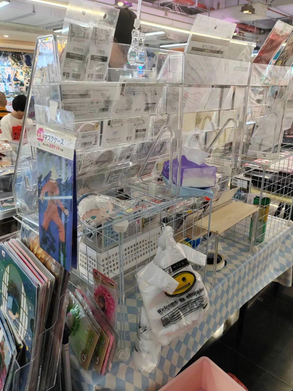 丽姨摊位上的谷子数量比别家多很多,且高出一大截,用了三个亚克力展示架和网格才勉强放下,摆满从国漫《非人哉》到日漫《蓝色禁区》等主流动漫的周边。桌子隔壁放了个大箱子,里面都是 10 元以下的旧 IP 老谷子,让顾客自己翻。