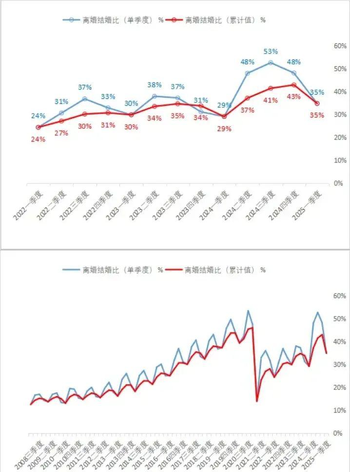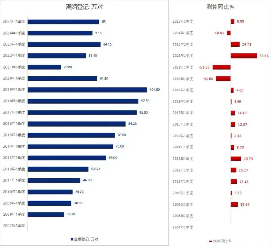 更为重要的是,观念在改变,离婚不再是传统观念中不堪,而是变成了 " 觉醒者的救赎 ",与其委曲求全,不如放过彼此。根据民政部最新数据显示,2025 年一季度全国离婚登记数达到 63 万对,创下历史新高,而同期结婚登记仅 181 万对。2024 年我国离婚率连续 17 年攀升,北上广深等一线城市离婚率突破 40%。这引发网上热议:这婚是非结不可吗?