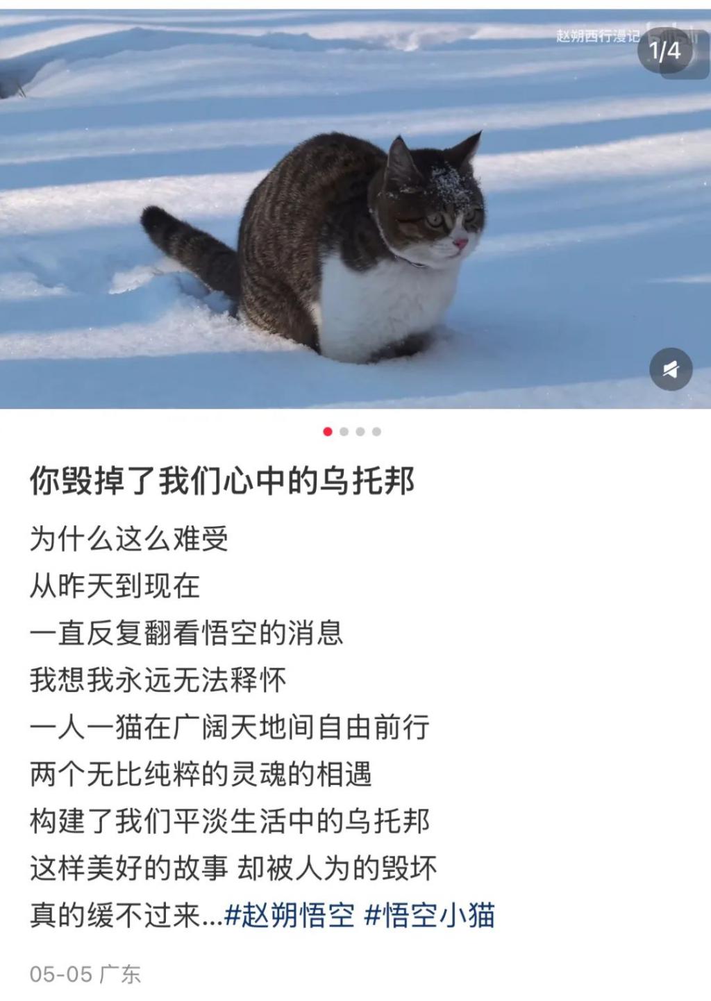 5月15日,悟空去世恰好一个月那天,36岁的江铭在社交平台上发帖称:"我准备和自己和解了,我确实走不出去了。悟空是赵朔的猫猫,但是悟空去世却是我们(的)精神创伤。"