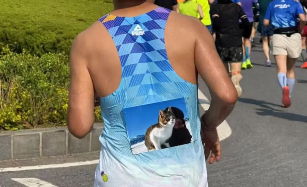 把悟空"背"在身上的跑者是今年40岁的成都人乔山。为了纪念悟空,乔山用别针把它的照片固定在运动背心上。一场半马跑下来,他遇到了至少4个悟空的粉丝。有个女孩在检录区看见他身上的悟空照片,当场没忍住,哭了起来。