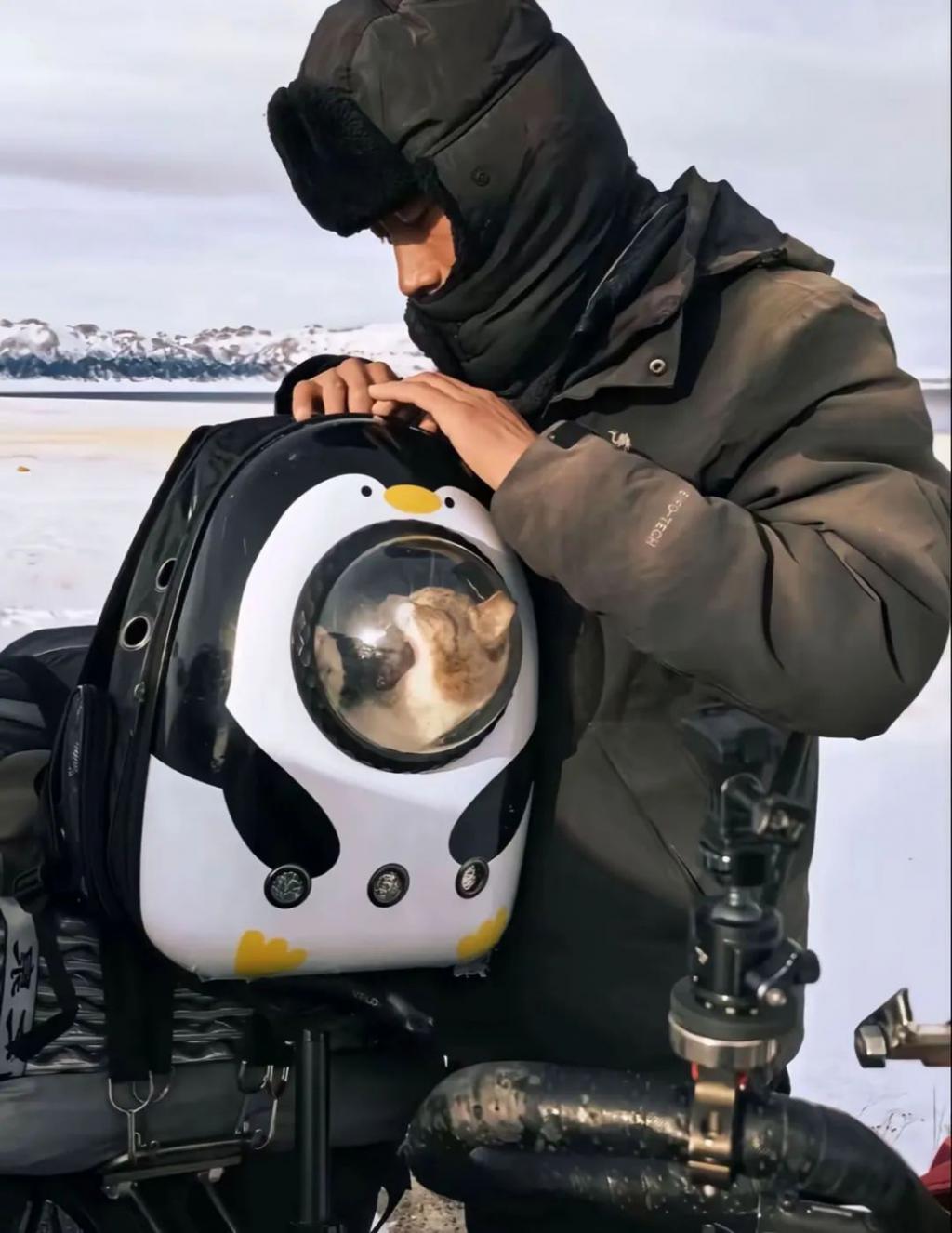 小猫名叫"悟空",是一只狸白相间的简州猫。2024年10月30日,它偶然闯进了骑行博主赵朔的帐篷。新疆阿勒泰喀纳斯村庄里,凌晨4点的雪夜,赵朔被帐篷外的猫叫吵醒。他拉开帐篷,让小家伙进来,小猫主动往赵朔怀里拱。从此,赵朔带上它,一人一猫,一路西行。