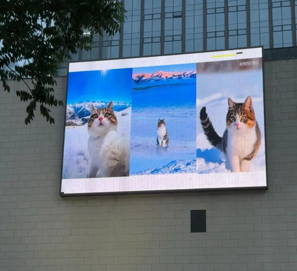 5月19日,在山东威海读研的郑瞳从学校出发,骑了半个小时自行车,到近6公里外的商城,只为在大屏幕上看一眼悟空。18.6米宽、8.4米高的LED屏上,循环播放着悟空在雪地里舔爪子的视频,还有一张网友自制的横幅海报,硕大的悟空占据海报画面三分之一,旁边有与猫咪脑袋齐大的白色行书写着它的名字。