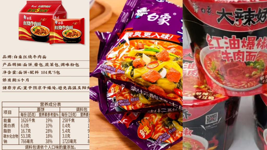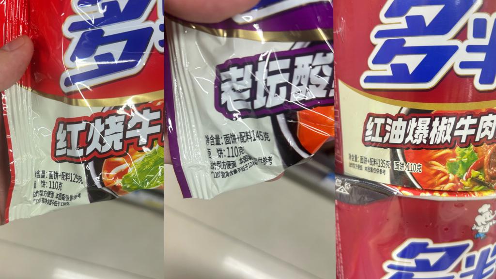 记者在超市找到了白象多半袋面红烧牛肉面、老坛酸菜牛肉面以及多半桶面红油爆椒牛肉面三款商品。多半袋面红烧牛肉面的包装显示 " 净含量:面饼 + 配料 129 克;面饼:110 克 ";多半袋面老坛酸菜牛肉面 " 净含量:面饼 + 配料 145 克;面饼 110 克 ";多半桶面红油爆椒牛肉面 " 面饼 + 配料 135 克;面饼:110 克 "。