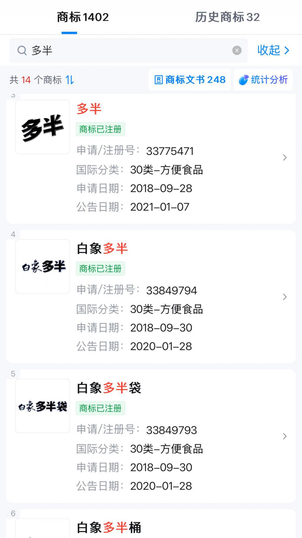 同时,记者在天眼查上查询到,与 " 多半 " 有关的商标有 14 个,9 个商标无效,5 个商标已注册,包括 " 多半 "、" 白象多半 "、" 白象多半袋 "、" 白象多半桶 ",大部分于 2018 年 9 月底申请。