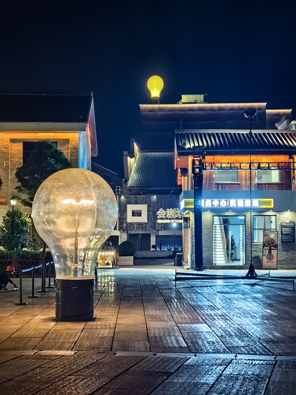 丁乃竺介绍,赖声川非常沉迷于在戏剧小镇安放超大尺寸的灯泡,期许着以灯泡来象征创意的火花和智慧明光,最终大家也的确排除万难,在会剧场的楼顶和广场上,真的竖立起两只巨大的灯泡,“要有光”,所以真的有了光。