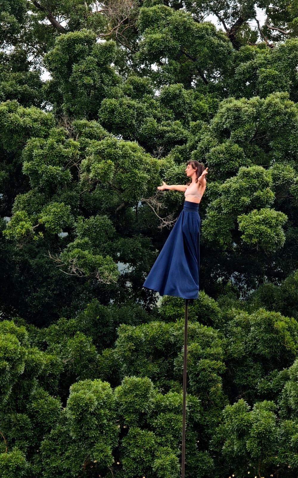 最先声夺人的是曾于巴黎奥运会开幕式表演的法国摩天剧团带来的“摇曳”,三位表演者高高地栖身在纤细的6米高的金属杆上,被难以察觉的微风轻轻吹动,宛如法国卡马格湿地的芦苇,与周围的景观进行着对话。在380岁的郁郁葱葱的慧榕旁,三位表演者沉思、摇曳,每一次摇摆都动人心魄。