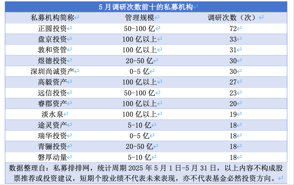 从私募的参与情况来看,5月共有48家证券私募积极参与A股调研,调研频次均不少于10次,其中40家调研10-19次,8家调研不少于20次。正圆投资调研最为积极,5月调研72次居首。百亿私募占据前十名中的五席,盘京投资、敦和资管、高毅资产、睿郡资产和淡水泉等5家百亿私募调研次数排名前十,5月依次调研33次、31次、27次、20次和19次。