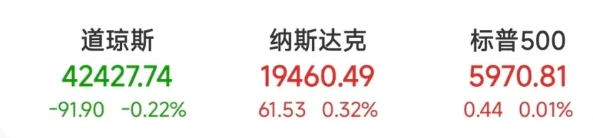 当地时间周三,道指收跌91.90点,跌幅为0.22%,报42427.74点;纳指收涨61.53点,涨幅为0.32%,报19460.49点;标普500指数收涨0.44点,涨幅为0.01%,报5970.81点。