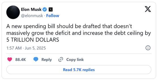 自那以来,马斯克已经发布或转发了二十多条帖子,要么明确批评该法案,要么就相关问题发表评论,比如美国的债务规模。