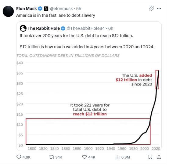 马斯克还在一则帖子中表示," 美国正走在通往债务奴役的快车道上。"