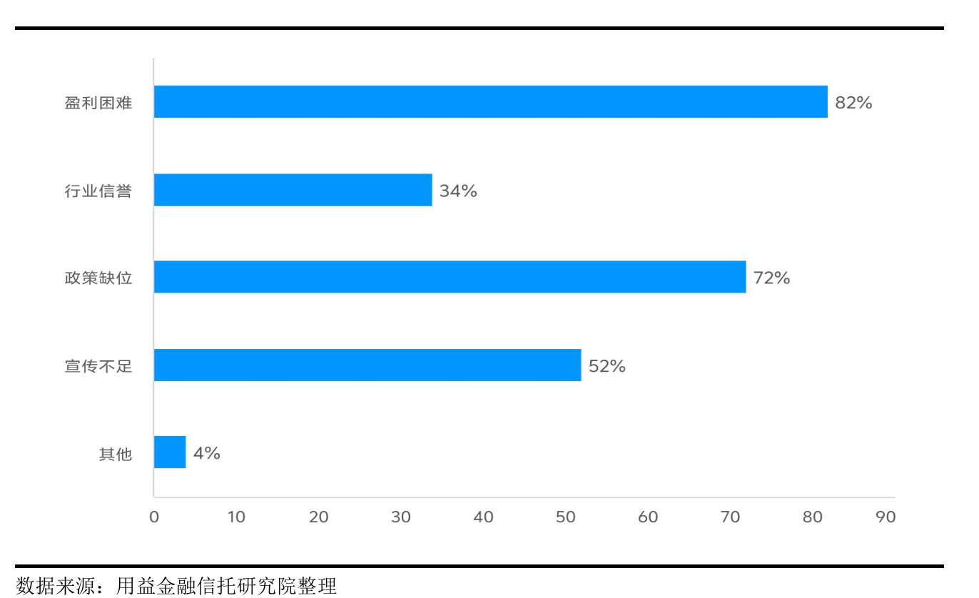 用益金融研究院近期的调研显示,82%的信托机构受访者认为,盈利能力不足是资产服务信托业务发展的重大阻碍;72%的受访者认为,政策缺位限制了服务信托业务的发展;52%的受访者认为,宣传不足同样影响服务信托业务的健康发展。