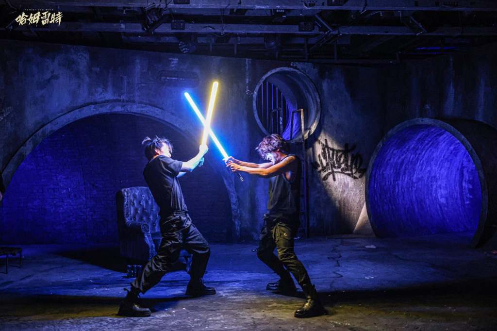作为青春版《哈姆雷特》,该剧还融入了多种现代艺术元素。电钢琴、吉他、非洲鼓等演奏的原创音乐,以及富有节奏感的轻声吟唱贯穿全剧,不仅营造出独特的戏剧氛围,也为古老故事注入了现代活力。滑板、蹦床、“星战”光剑等道具的运用,既增添了表演的灵动与趣味,也为角色行动和情感表达提供了更多可能,大大拓展了舞台表现空间。