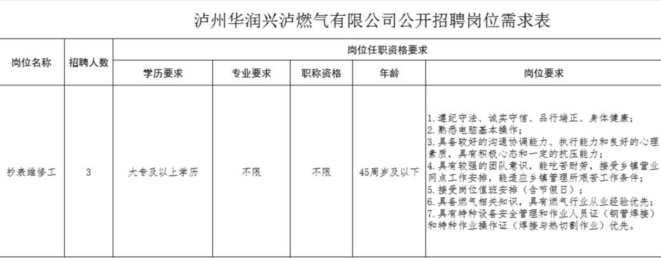 据了解,2025 年 5 月底,泸州华润兴泸燃气有限公司面向社会公开招聘,招聘 3 名抄表维修工,学历要求是大专以上,岗位除了基本要求之外,还要求具备燃气相关知识,具有燃气行业从业经验优先,具备特种设备安全管理和作业人员证(钢管焊接)和特种作业操作证(焊接与热切割作业)优先。