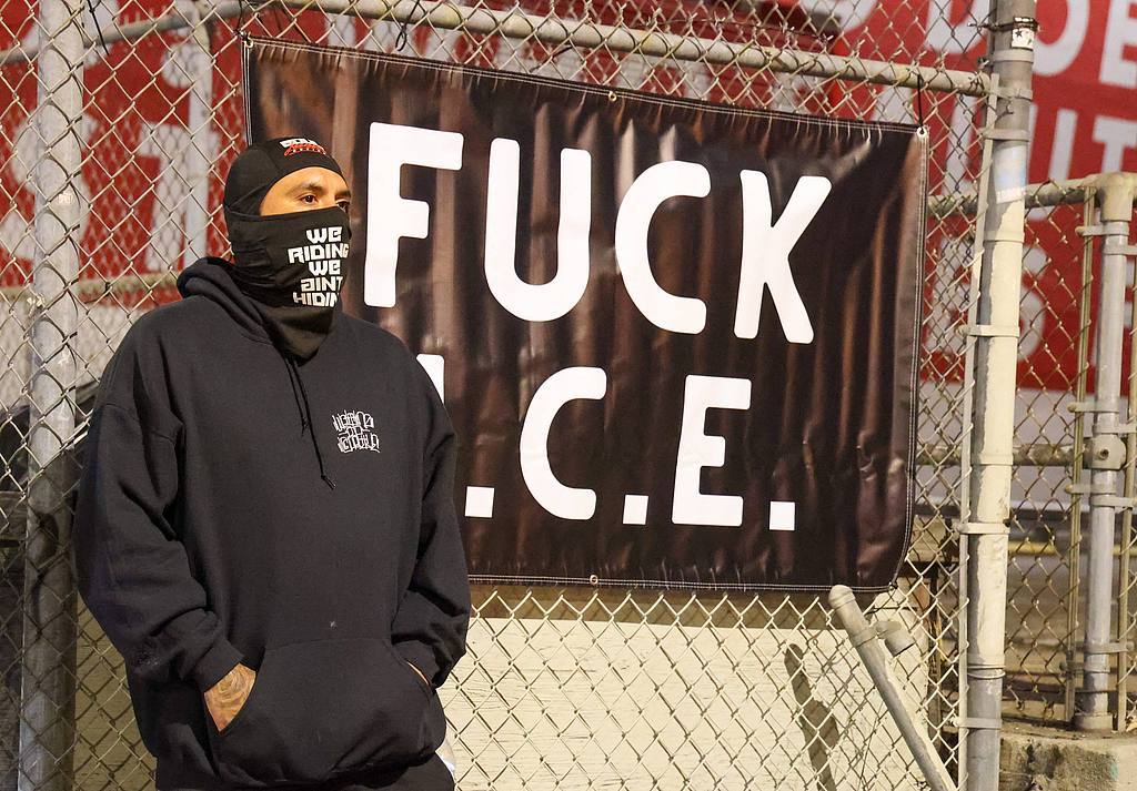 当地时间2025年6月7日,美国洛杉矶市中心联邦大楼附近的ICE拘留中心,移民及海关执法局(ICE)抗议者与洛杉矶警察局(LAPD)对峙。一名男子戴着写有“我们正在行动,我们不会躲藏”字样的面具。此前,近100名涉嫌非法移民被捕并被带到附近的ICE拘留中心。