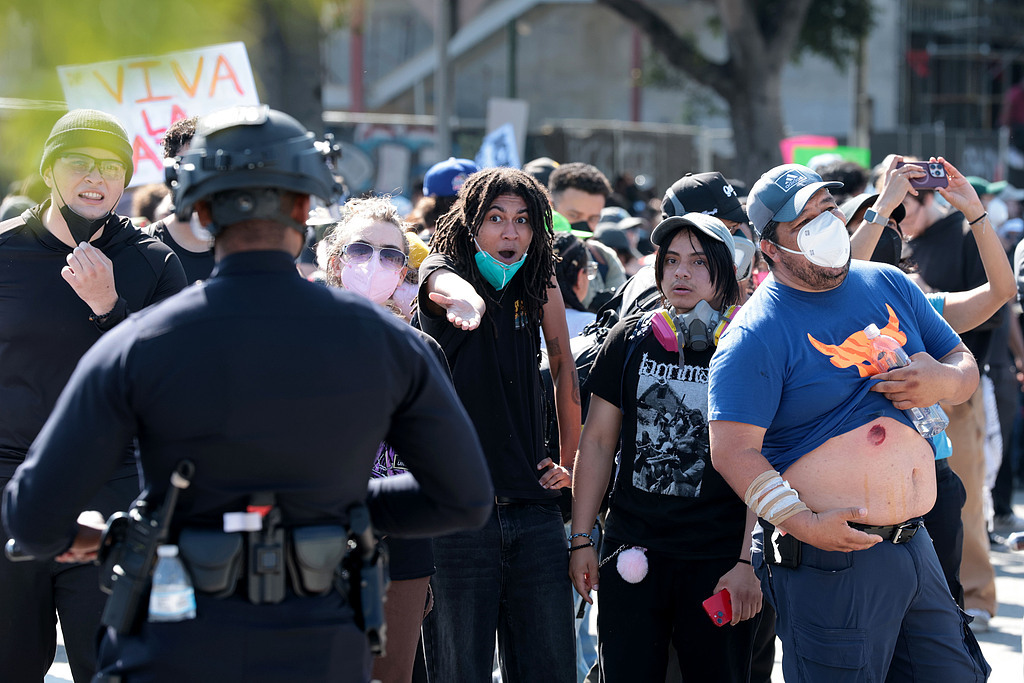 当地时间2025年6月8日,美国洛杉矶,大都会拘留中心附近,一名抗议者(中)向警察大喊,另一名抗议者展示他被橡皮子弹击中的地方。