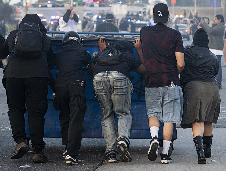 当地时间2025年6月7日,美国洛杉矶派拉蒙区,移民和海关执法局(ICE)的特工和国土安全部(DHS)的官员对非法移民进行突击搜查后,抗议者用购物车作掩护,躲避警察发射的闪光弹。