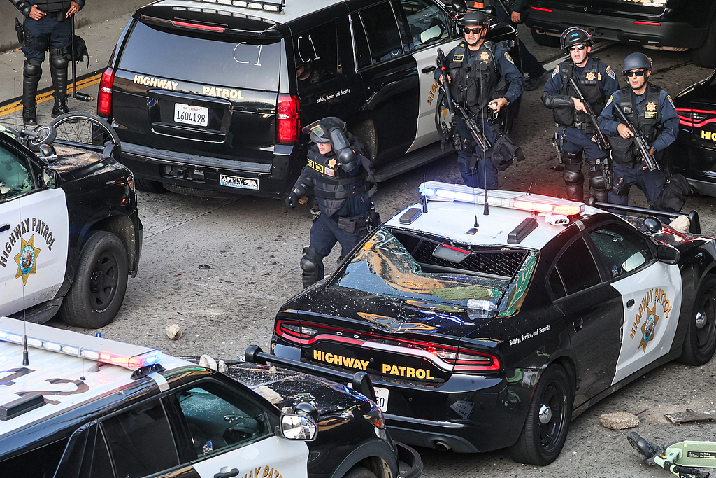 当地时间2025年6月8日,美国加利福尼亚州洛杉矶,爱德华·罗伊巴尔联邦大楼附近,警察在101号高速公路上阻止交通,以应对抗议移民突袭的激进分子。