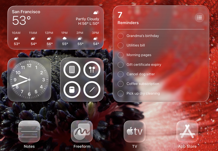 以iOS 26锁屏为例,时间字体会根据壁纸内容智能收缩,背景根据主角图像自动调节透明与模糊,让用户视线聚焦于重要信息。在iPadOS/macOS 中,侧边栏和菜单栏更像是漂浮窗格,能折射背景,减少视觉干扰。