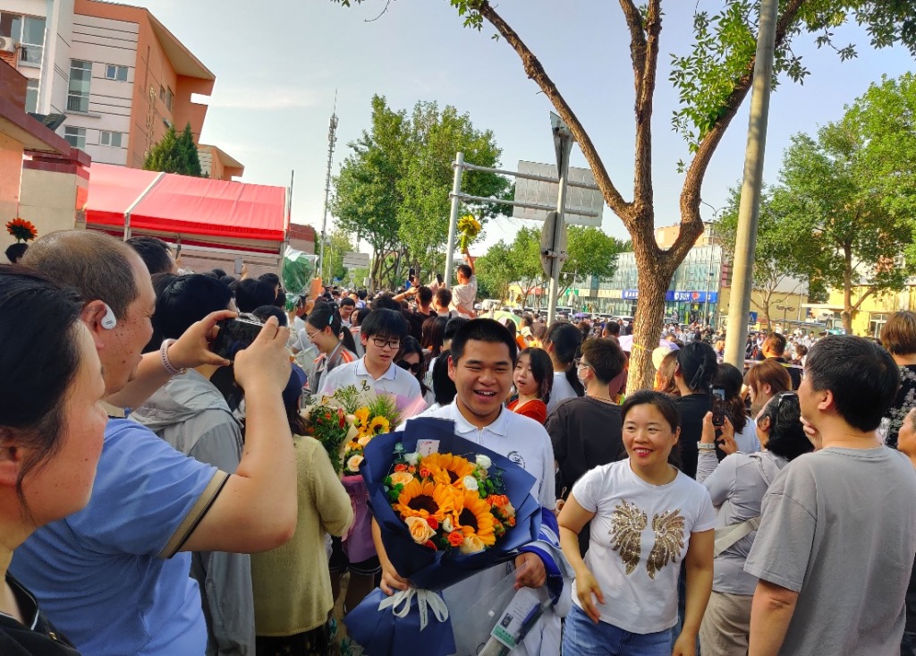 6月10日下午5时许,北京昌平二中回龙观校区考点外,手捧鲜花的考生们。