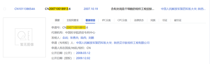 根据前述艾尔肤提供的专利证号,界面新闻记者在国家知识产权局官网进行查询发现,2007年,中国人民解放军第四军医大学、陕西艾尔肤组织工程有限公司申请了“含有外周血干细胞的组织工程皮肤及其制备方法”的专利。