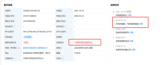 2014年,该专利的专利权发生转让。天眼查显示,该专利的专利权人从中国人民解放军第四军医大学变更为陕西艾尔肤组织工程有限公司。但因未缴年费专利权,该专利的专利权已经在2021年10月19日宣告终止。