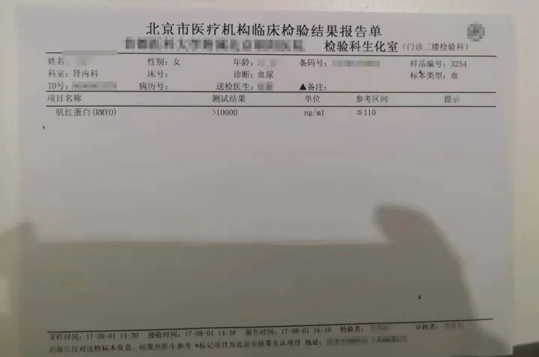 化验单上写着“肌红蛋白>10000”,是正常值的100倍。丨 作者供图